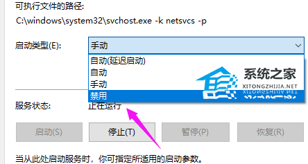 3. 在打开的窗口界面中,将“启动类型”设置为“禁用”。