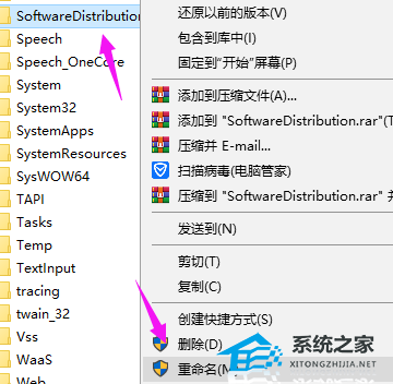 6. 进入到新界面后,找到“C:WindowsSoftwareDistribution”,并右击选择选项列表中的“重命名”。