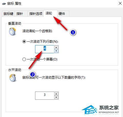 6. 然后在给出的窗口中,切换到上方中的“滚轮”选项卡,找到“一次滚动下列行数”,并将框中的数字改为自己想要的数字,最后点击应用确定就可以了。