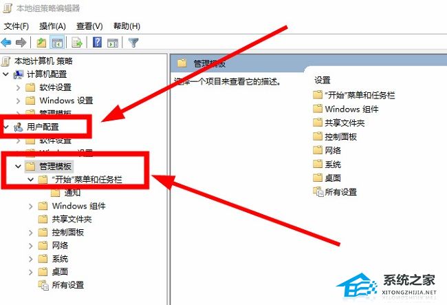 2. 进入到新的窗口界面后,依次点击左侧栏中的“用户配置——管理模板——开始菜单和任务栏”选项。