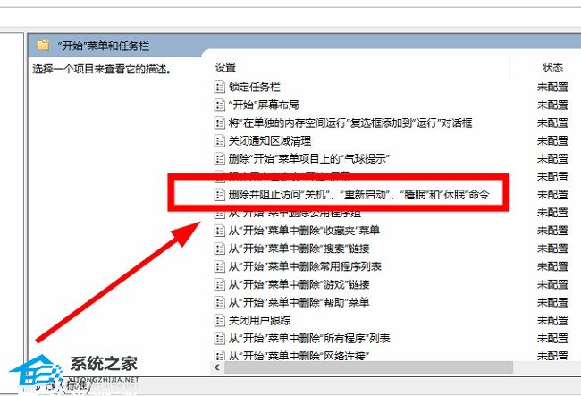 3. 然后找到右侧中的“删除并阻止访问关机、重新启动、睡眠和体眼命令”双击打开。