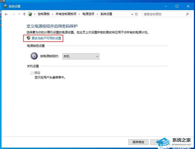 3. 路径【控制面板 > 所有控制面板项 > 电源选项 > 系统设置】,系统设置窗口中,点击定义电源按钮并启用密码保护(选择要为你的计算机设置的电源设置。在此页上对设置所做的更改将应用于你所有的电源计划。)下的【更改当前不可用的设置】;