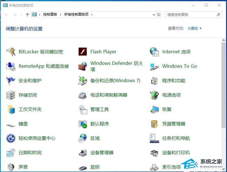 1. 按【 Win + S 】组合键,打开搜索,搜索框中,输入【控制面板】,然后点击并【打开】系统给出的最佳匹配控制面板应用。所有控制面板项窗口中,切换到【大图标】的查看方式,点击调整计算机的设置下的【电源选项】;