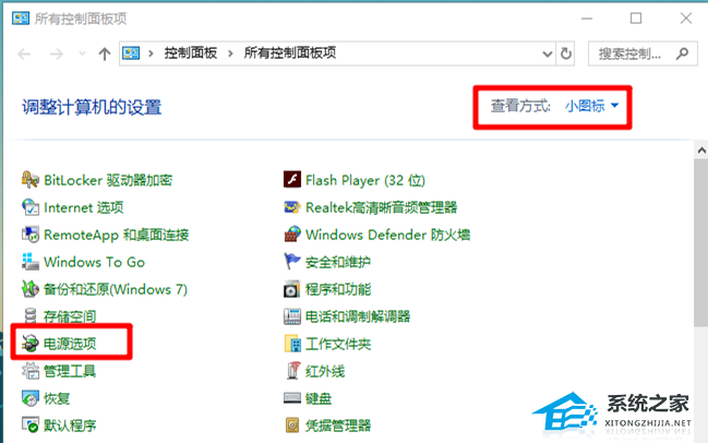 4. 所有控制面板项窗口中,点击右上角,将查看方式,切换为【小图标】,然后点击调整计算机的设置下的【电源选项】;