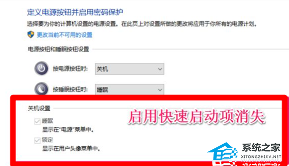 6. 在打开的窗口中,可以看到关机设置下的启用快速启动选项消失了,这也就意味着快速启动功能已经设置为关闭状态。