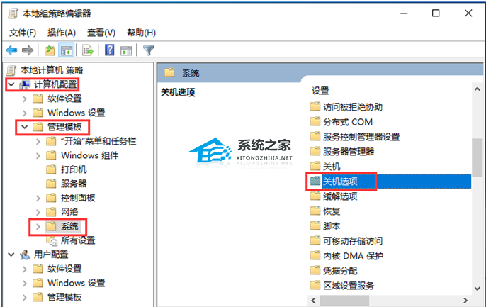 2. 本地组策略编辑器窗口,左侧依次展开【计算机配置 > 管理模板 > 系统】,右侧找到并双击【关机选项】;