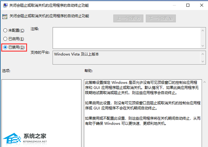 4. 关闭会阻止或取消关机的应用程序的自动终止功能窗口,选择【已禁用】,再点击【应用确定】。