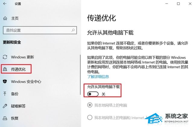 2. 点击“传递和优化”,关闭“允许从其他电脑下载”的开关。