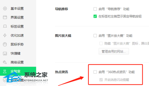 3. 在弹出的界面左侧任务栏中找到【实验室】,勾选【启用“360热点资讯”功能】即可。