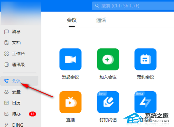 1. 将电脑中的钉钉进行登录,将左侧的【会议】选项进行点击一下。