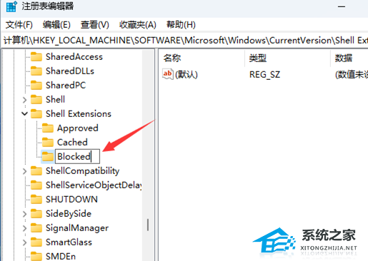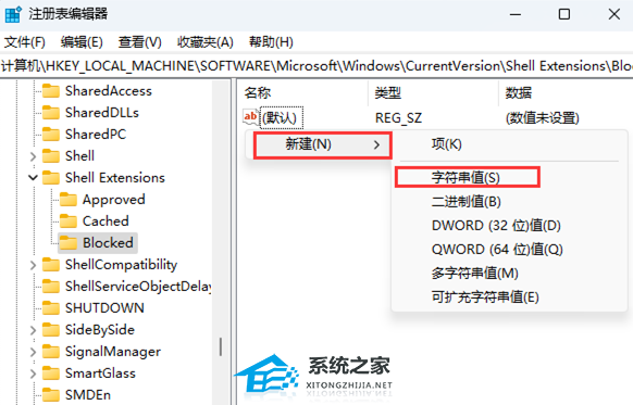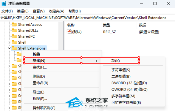 4. 选择【Shell Extensions】,然后点击【右键】,在打开的菜单项中,选择【新建-项】;