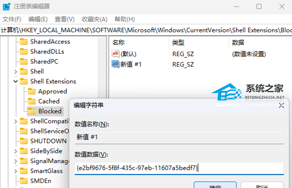 7. 双击【新建的字符串值】,然后在打开的编辑字符串窗口,将数值数据修改为【{e2bf9676-5f8f-435c-97eb-11607a5bedf7}】。