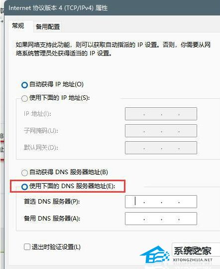 5. 默认选择的是自动获得DNS服务器地址,点击使用下面的DNS服务器地址,填入首选DNS服务器地址和备用DNS服务器地址,点击确定即可。