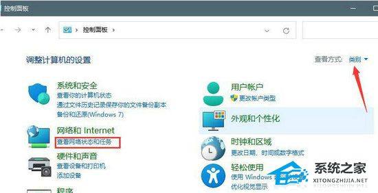 2. 切换到类别查看方式,点击调整计算机的设置下的查看网络状态和任务。
