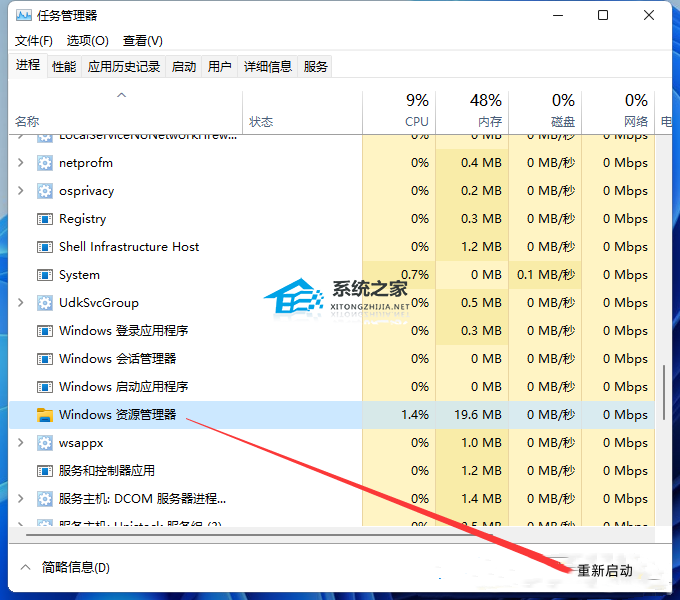 3. 选择Windows 资源管理器进程,点击右下角的重新启动,即可重启Windows资源管理器,这其实是Windows资源管理器进程explorer.exe结束后,又重新启动的过程。