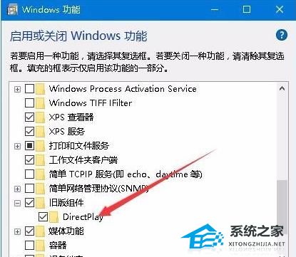 8. 最后在窗口中,找到“旧版组件”中的“DirectPlay”,并将其小方框勾选上,点击确定保存就可以了。