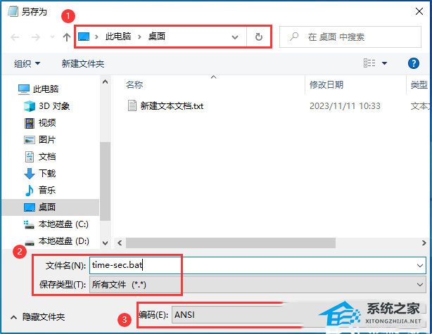2)文件名填入以【.bat】结尾的名称,保存类型选择【所有文件】