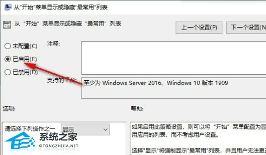 5. 在“从“开始”菜单显示或隐藏“最常用”列表”的弹框中点击选择已启用选项,确定保存即可。