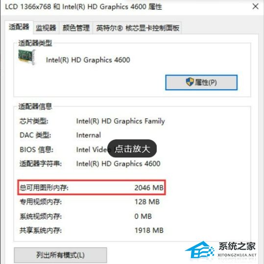 3. 进入到显卡属性查询界面,通过该界面可以查看显卡显存大小。