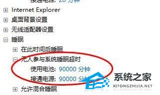7. 最后找到“睡眠”下“无人参与系统睡眠超时”,将时间改为“90000分钟”即可。