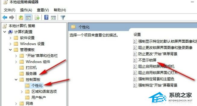 3. 打开控制面板和个性化选项,在右侧页面中找到“不显示锁屏”选项。