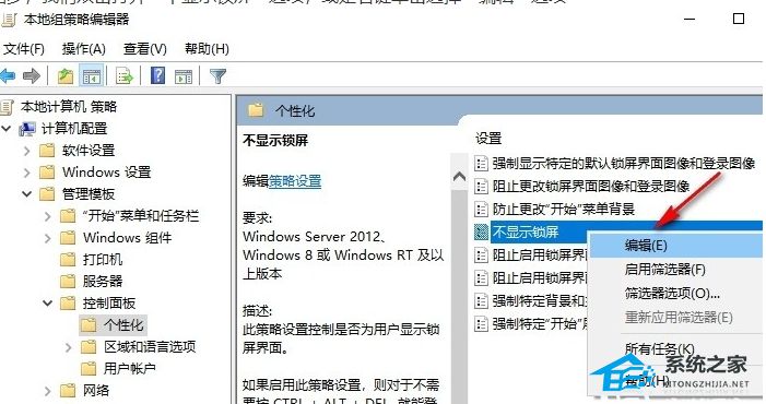 4. 双击打开“不显示锁屏”选项,或是右键单击选择“编辑”选项。