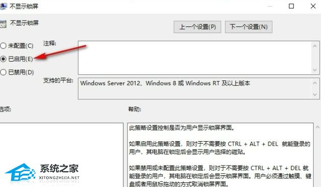 5. 在不显示锁屏页面中,点击“已启用”选项,确定保存即可。