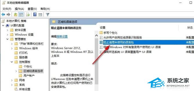 3. 然后找到右侧中的“阻止清理未使用的语言包”双击打开。