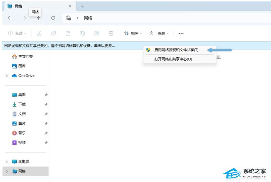 1. 打开「文件资源管理器」,在左侧导航窗格点击「网络」。如果网络发现未开启,系统将显示一条提示,指出网络发现和文件共享已关闭。