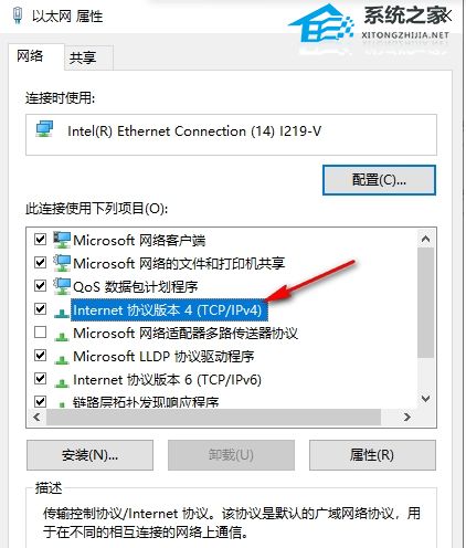 4. 在页面上弹出一个属性窗口,将页面上的【Internet协议版本4】选项找到之后,使用鼠标双击一下进入到页面。