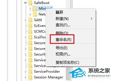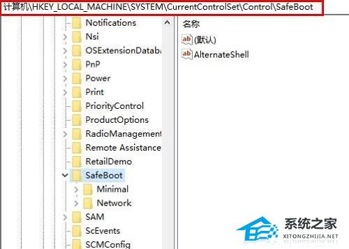 5. 进入到注册表编辑器后,将“HKEY_LOCAL_MACHINESYSTEMCurrentControlSetControlSafeBoot”复制粘贴到上方地址栏中,并回车定位到此。