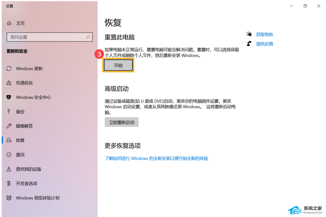 2. 更新和安全主页设置窗口中,右侧在重置此电脑的选项中,点击【开始】;