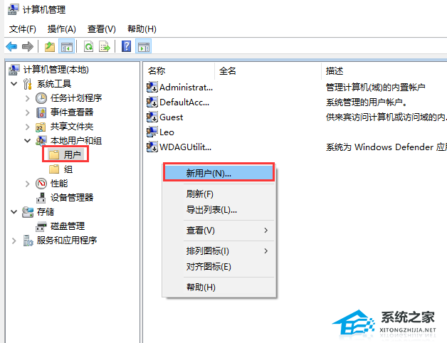 2. 计算机管理窗口中,点击左侧【系统工具 - 本地用户和组 - 用户】,然后在右侧空白处,点击【右键】,在打开的菜单项中,选择【新用户】;