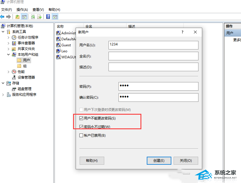 3. 新用户窗口中,输入【用户名和密码】,【取消勾选】用户下次登录时须更改密码,同时【勾选】用户不能更改密码和密码永不过期;