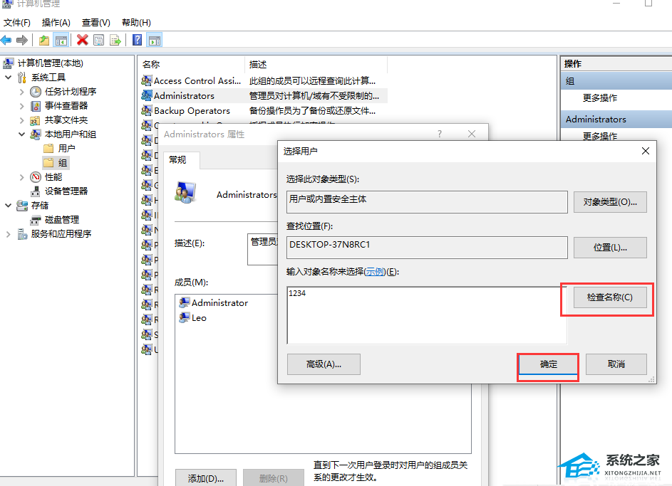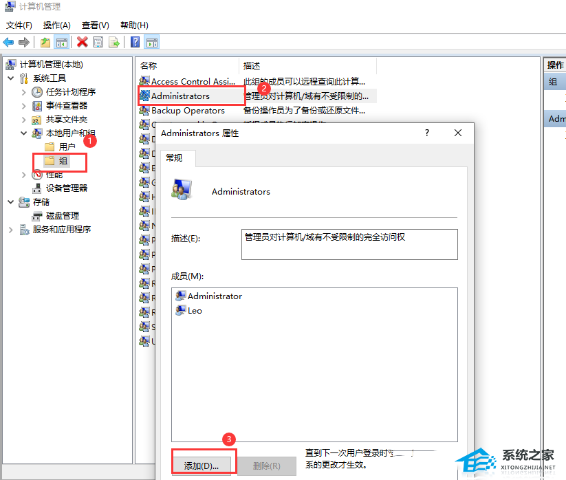 4. 点击创建之后,新用户就创建成功了,但此时创建的账户是标准账户,没有管理员权限,接下来的操作是添加管理员权限。返回到计算机管理窗口,点击左侧【系统工具 - 本地用户和组 - 组】,然后双击右侧的【Adminstrators】,点击下方的【添加】;