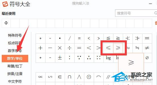 3. 在“数学/单位”里就能找到“大于等于号”了,点击即可打出。