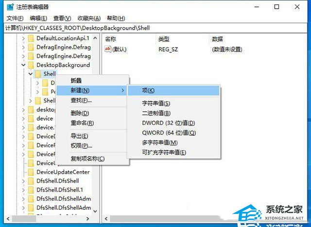 3. 右键 shell 项,在打开的菜单项中,选择新建,选择项;