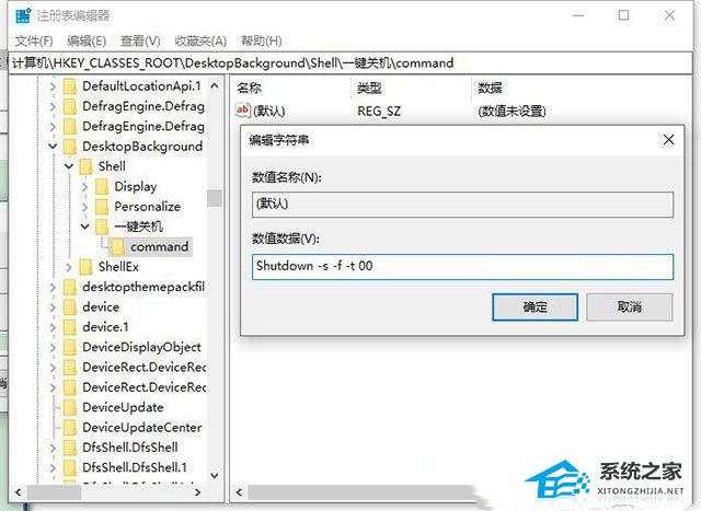 6. 点击 command 项,双击右侧栏中的默认,在数值数据处,输入 Shutdown -s -f -t 00 ,点击确定。