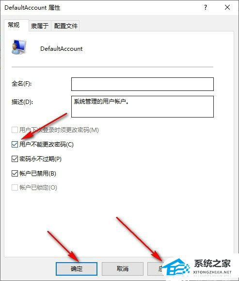 5. 进入用户的属性页面之后,勾选“用户不能更改密码”选项,确定保存即可。