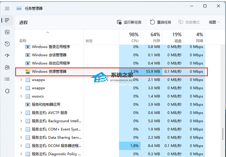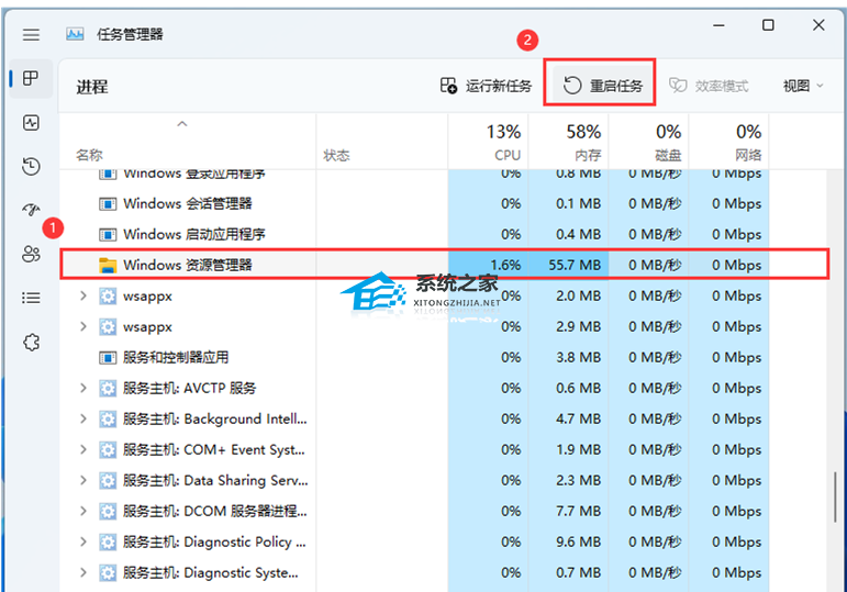 3. 选择【Windows 资源管理器】进程后,再点击右上方的【重启任务】,即可重启Windows 资源管理器,这其实是Windows 资源管理器进程explorer.exe结束后,又重新启动的过程。