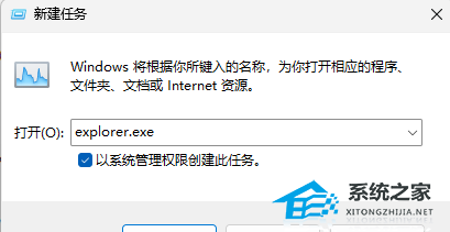 5. 新建任务窗口,输入【explorer.exe】命令,按【确定或回车】,即可重新启动Windows 资源管理器(建议勾选以系统管理权限创建此任务)。