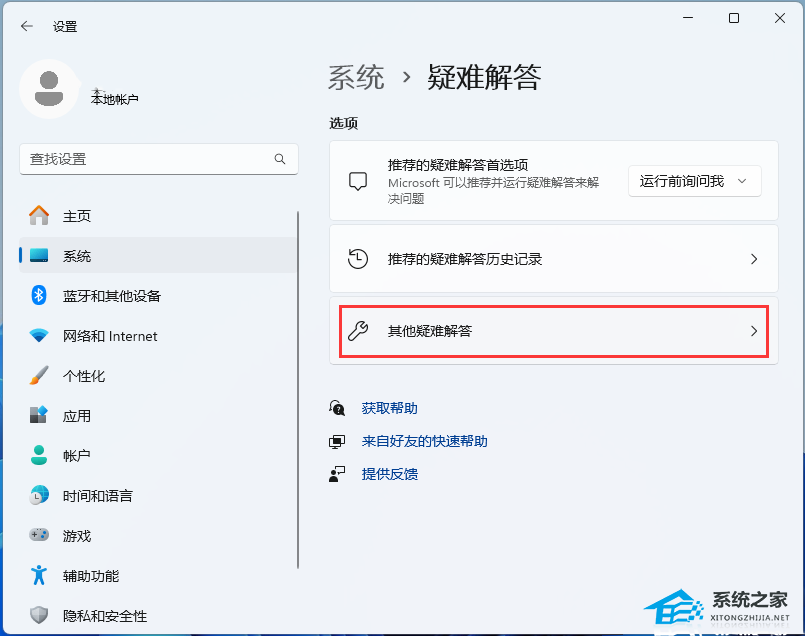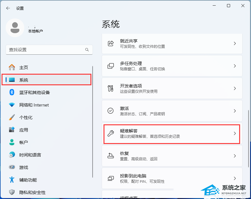 2. 设置窗口,左侧点击【系统】,右侧点击【疑难解答(建议的疑难解答、首选项和历史记录)】。