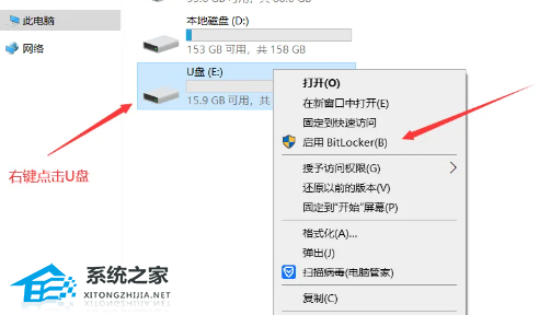 2. 右键选择U盘,然后选择“启用Bitlocker”。
