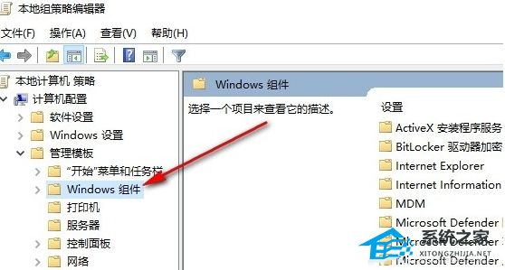 3. 打开管理模板选项之后,在下拉列表中再点击打开“Windows组件”选项。
