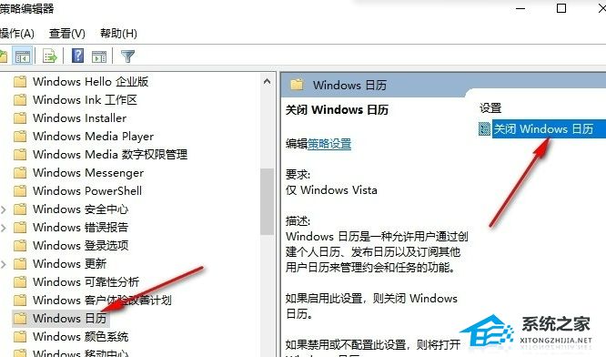 4. 在“Windows组件”中,找到“Windows日历”选项,双击打开页面右侧的“关闭Windows日历”选项。