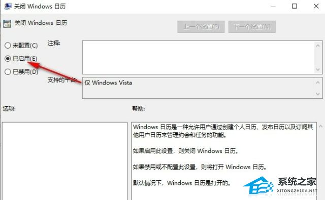 5. 最后在“关闭Windows日历”的弹框中先点击“已启用”选项,再点击确定选项即可。