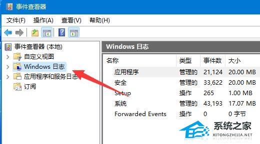 3. 打开后,点击左边栏的“Windows日志”。