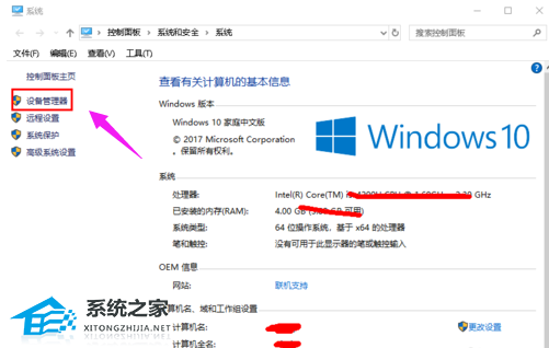 2. 在属性中的电脑基本信息界面中选择设备管理。