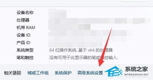 2. 进入到新的界面后,点击“相关链接”中的“高级系统设置”。