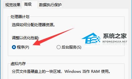 5. 然后切换到上方中的“高级”选项卡,将“调整以优化性能”中的“程序”勾选上,最后点击确定保存即可。